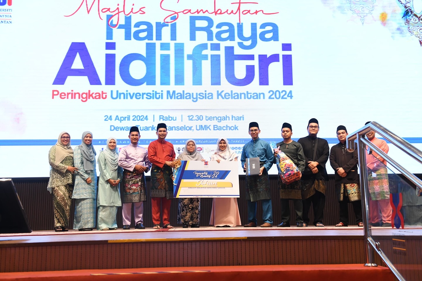 Majlis penyampaian hadiah telah disempurnakan oleh Ahli Lembaga Pengarah Universiti, Puan Salmira binti Shukri dan Pendaftar UMK, Khairul Eruwan Abdul Halim pada Majlis Sambutan Hari Raya Aidilfitri Peringkat Universiti 2024 di Dewan Tuanku Canselor, UMK Bachok, hari ini.