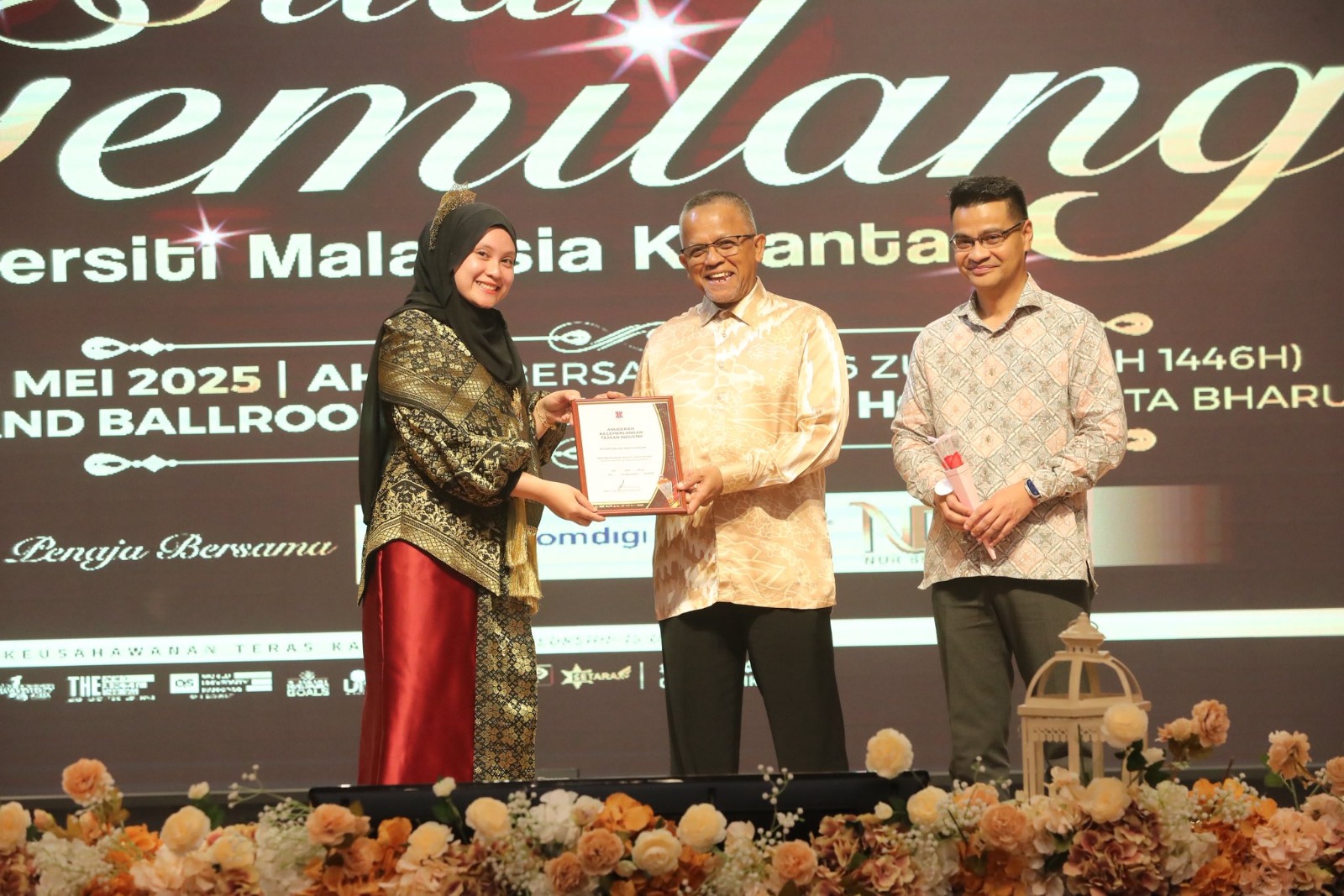 Anugerah itu telah disampaikan oleh Pengerusi Lembaga Pengarah Universiti Malaysia Kelantan, Dato’ Dr. Hassan Basri Awang Mat Dahan dan diringi oleh Naib Canselor UMK, Prof. Ts. Dr. Arham Abdullah.